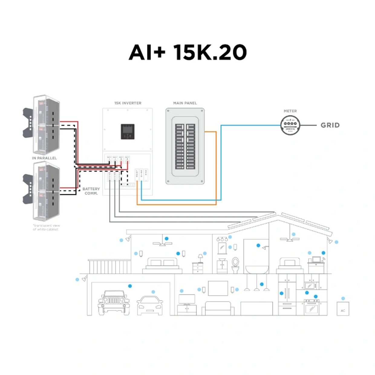 Power all the energy consuming items in the AI+ 12K.15 package plus the AC. water heater. and electric washer/dryer. Benefits: integrated smart switch, quicker install, larger solar array.